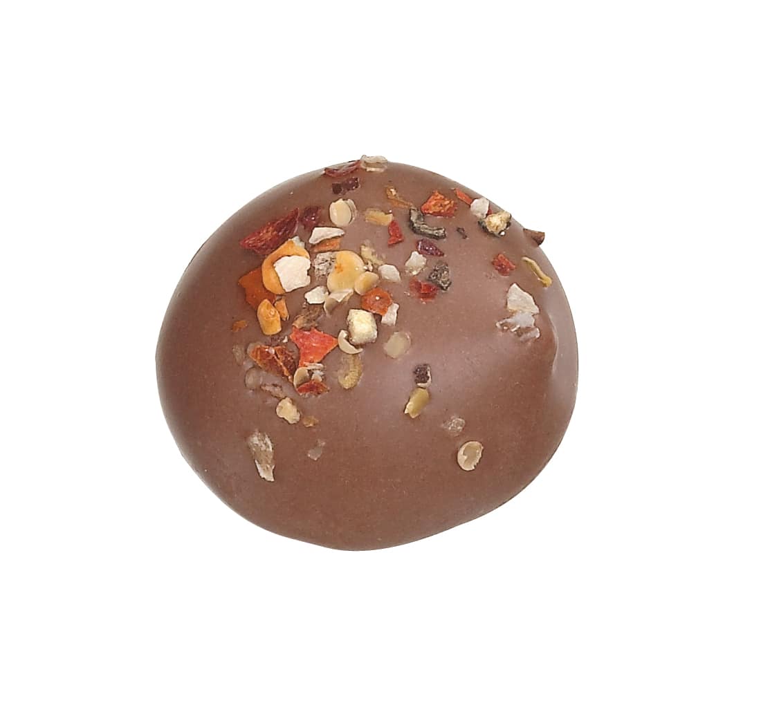 Sugar, Cocoa mass, Cocoa butter, Whole milk powder, Butter (from milk), Glucose syrup, Mango, Alcohol, Modified starch, Propylene glycol, Citric acid, flavours: Ginger, Chilli, Emulsifier: Soya lecithin, Natural Vanilla, Salt (trace).